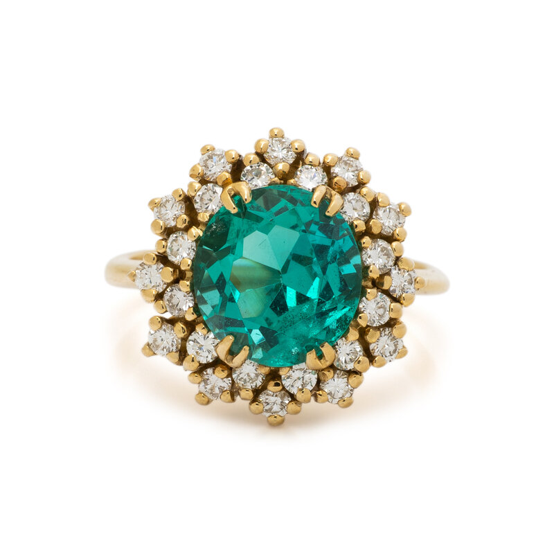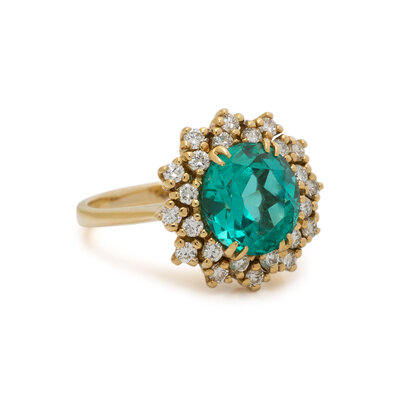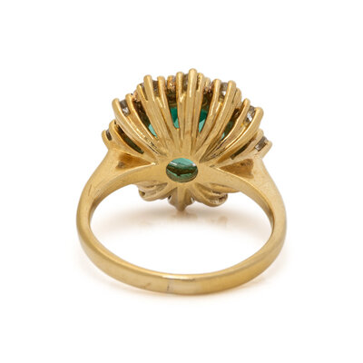 Featuring an oval emerald weighing approximately 3.00 carats by formula, surrounded by round diamonds weighing approximately 0.45 carat total. Mounted in 18 karat yellow gold. Ring size 6.