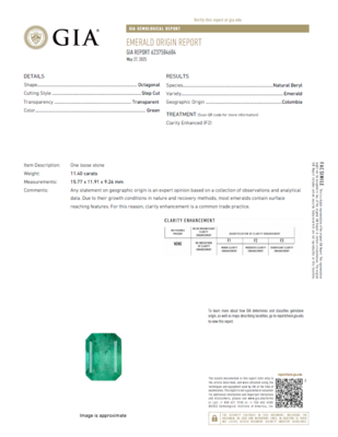 GIA, 2025, Report No. 6237584684, Natural Beryl, Emerald, Colombia, Moderate Clarity Enhancement (F2)