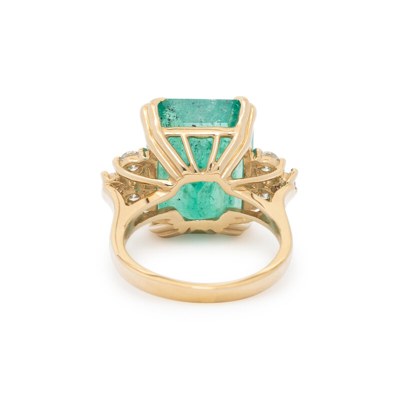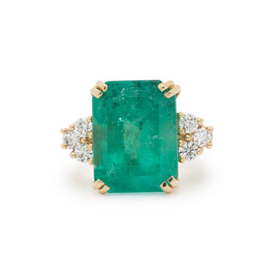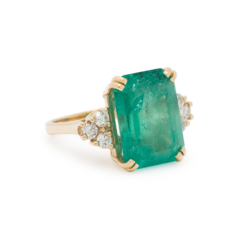 Featuring an emerald cut Colombian emerald weighing 11.40 carats, flanked by triads of round diamonds weighing approximately 0.50 carat total. Mounted in 14 karat yellow gold. Ring size 6 1/4.