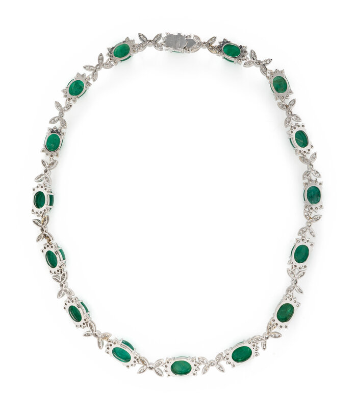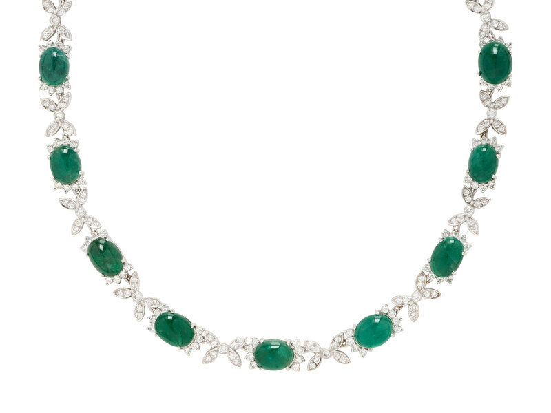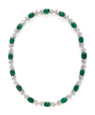 Set with 16 oval cabochon cut emeralds weighing approximately 55.00 - 65.00 carats total by formula, separated by milgrained 'X' motifs set with round diamonds weighing approximately 4.50 carats total. Mounted in white gold. 15 7/8 inches long.