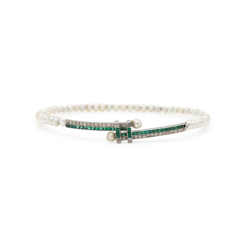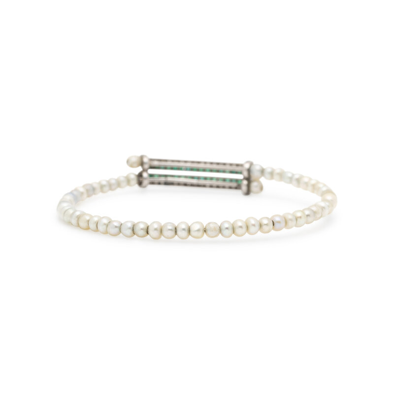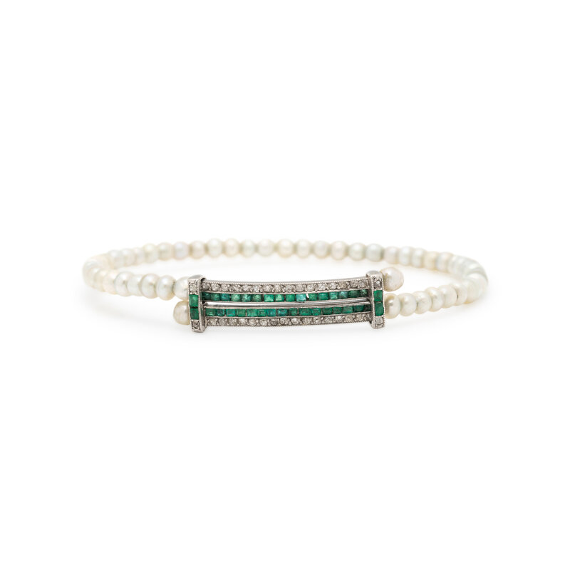 Set with numerous pearls measuring approximately 3.25 - 4.00 mm, the central element set with old mine cut diamonds weighing approximately 0.70 carat total and square emeralds. Mounted in platinum. 6 1/2 - 7 1/4 inches inner circumference.