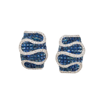 Set throughout with calibré-cut sapphires, accented by a snaking line of round diamonds. Mounted in 18 karat white gold. 11/16 inch long.