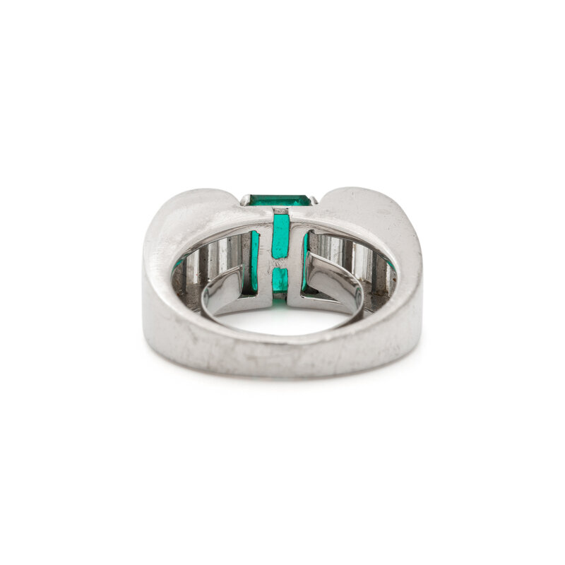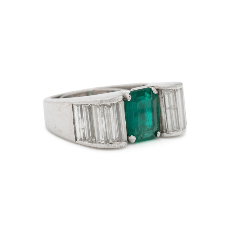 In an arched design with an emerald cut emerald weighing approximately 1.00 carat by formula, flanked by rows of baguette cut diamonds weighing approximately 3.40 carats total. Mounted in platinum. Ring size 5 3/4.