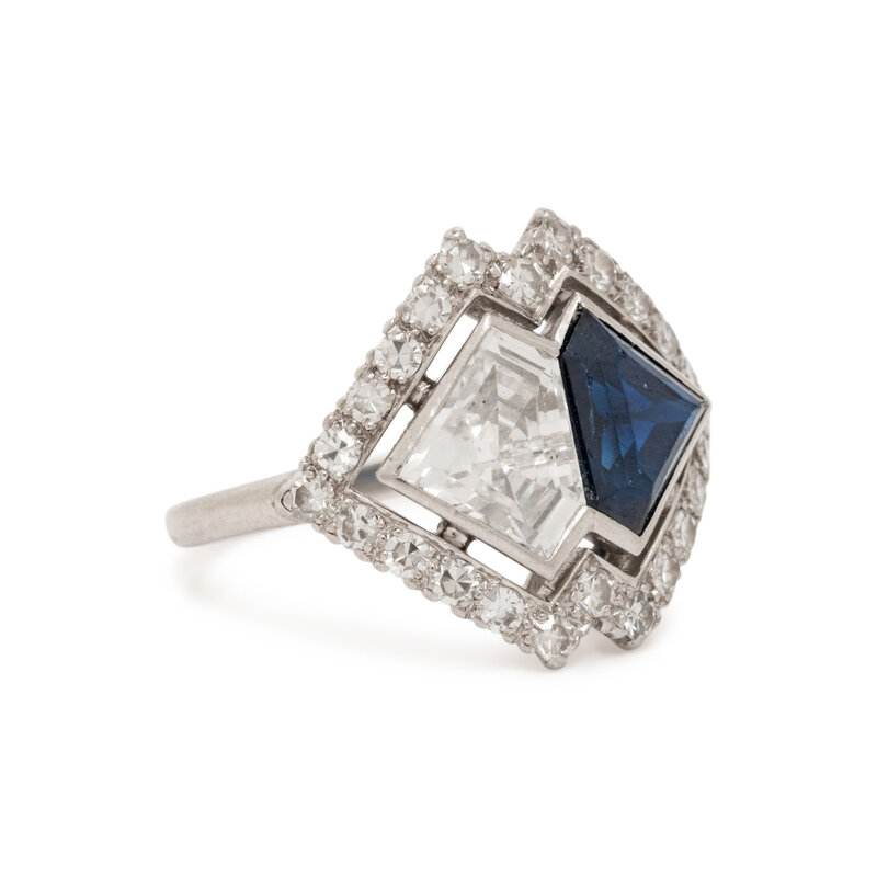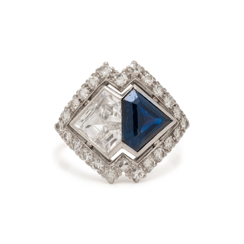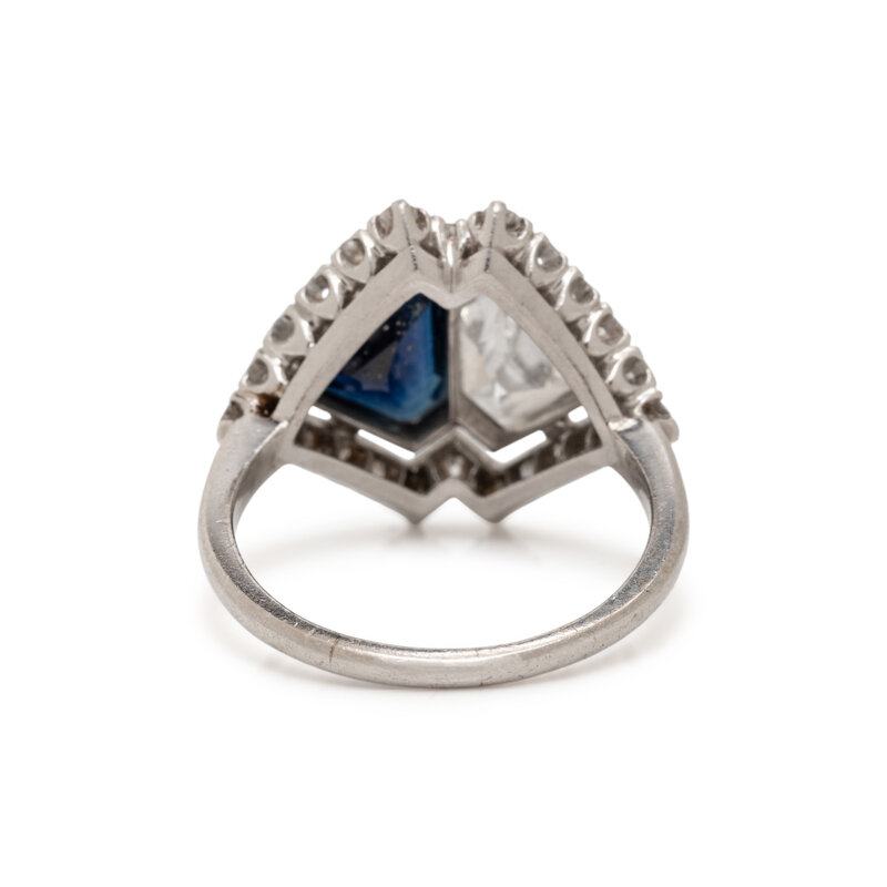 In a geometric design, with a calf's head cut diamond weighing approximately 2.55 - 2.75 carats by formula juxtaposed by a calf's head cut sapphire weighing approximately 3.00 carats by formula, surrounded by additional single cut diamonds weighing approximately 0.70 carat total. Mounted in platinum. Ring size 7 1/4.