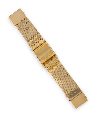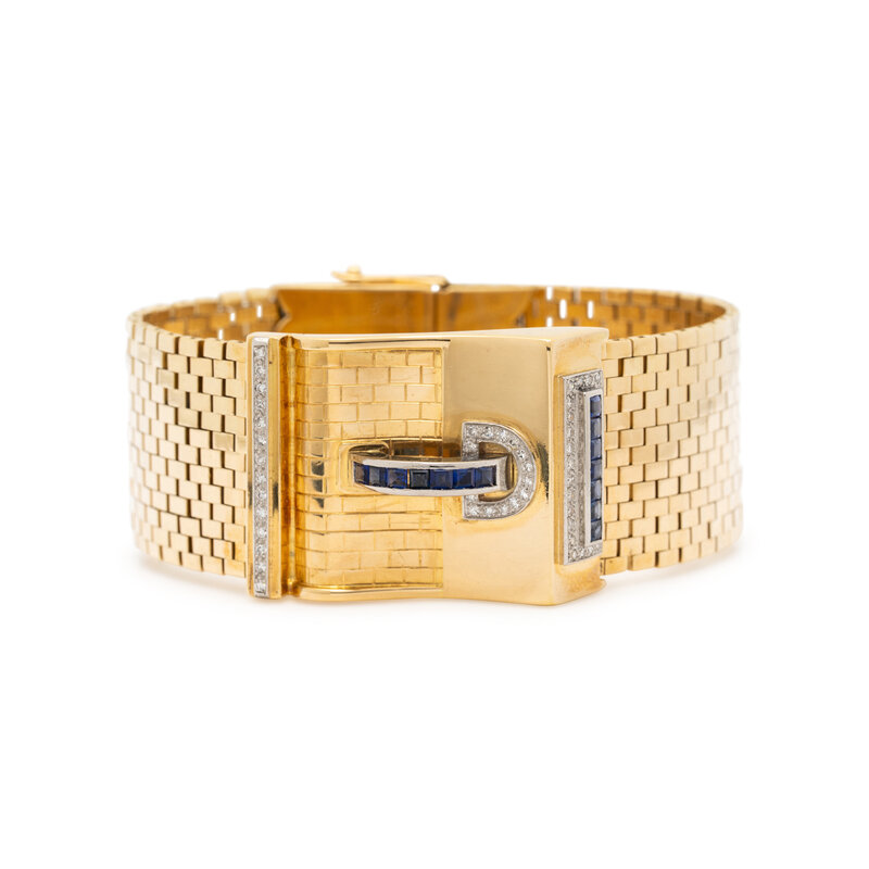 The central buckle-style element set with square sapphires and single cut diamonds, on a brick link bracelet. Mounted in 18 karat yellow and white gold. 7 3/8 inches long, 1 1/8 inches wide.