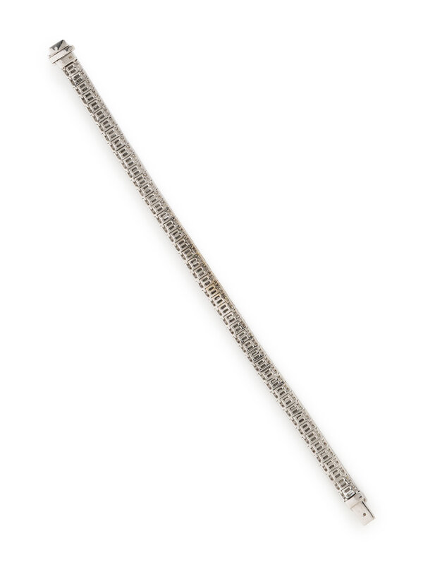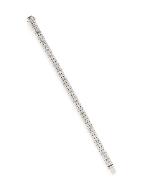 Central row of baguette cut diamonds edged by round brilliant cut diamonds weighing approximately 9.40 carats total. Mounted in 18 karat white gold. 7 1/4 inches long.