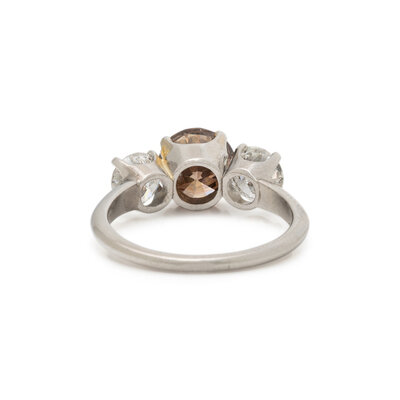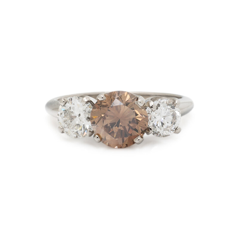 Featuring a round brilliant cut Fancy Dark Orangy Brown diamond weighing 2.00 carats, flanked by two transitional cut diamonds weighing approximately 1.40 carats total. Mounted in platinum. Ring size 6 3/4.