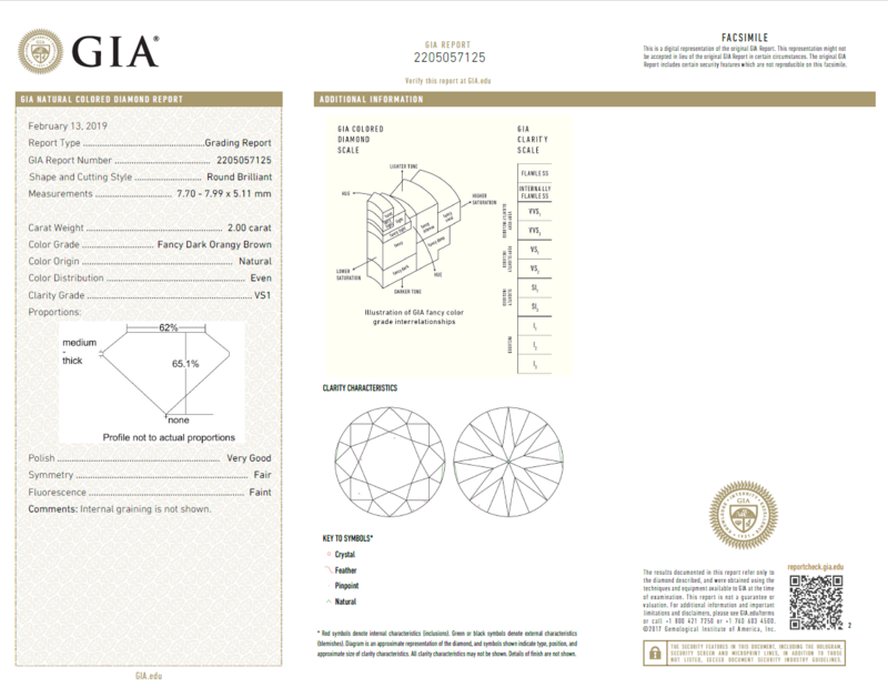 GIA, 2019, Report No. 2205057125, 2.00 carat, Fancy Dark Orangy Brown color, Natural, Even color distribution, VS1 clarity, Faint Fluorescence