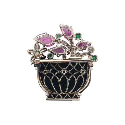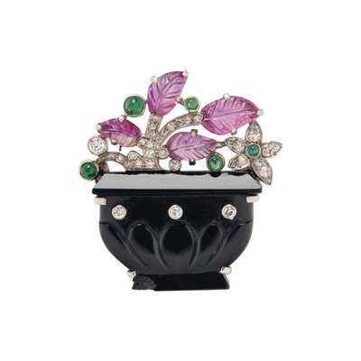 Depicting a flower pot, the base set with carved black onyx, and the flowers designed in single and transitional cut diamonds with round cabochon emerald accents and carved ruby leaves. Mounted in platinum. 1 5/16 1 1/4 inches.