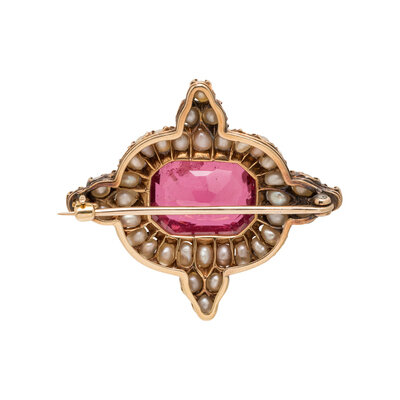 Featuring an octagonal modified mixed cut pink tourmaline weighing approximately 18.00 - 22.00 carats by formula, surrounded by seed pearls. Mounted in yellow gold. 1 5/8 x 1 3/8 inches.