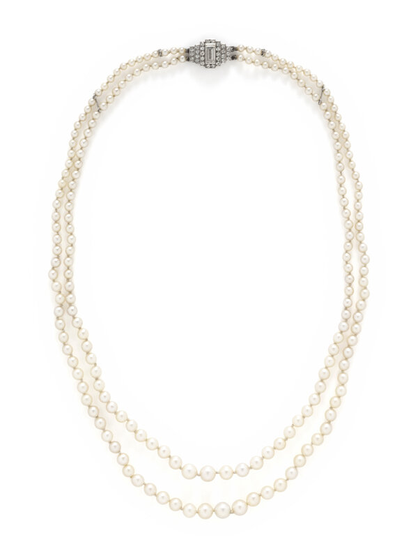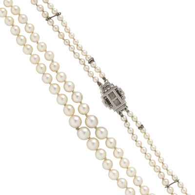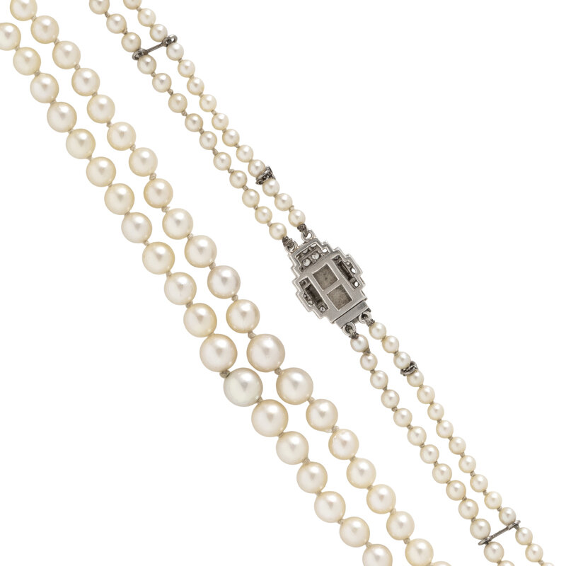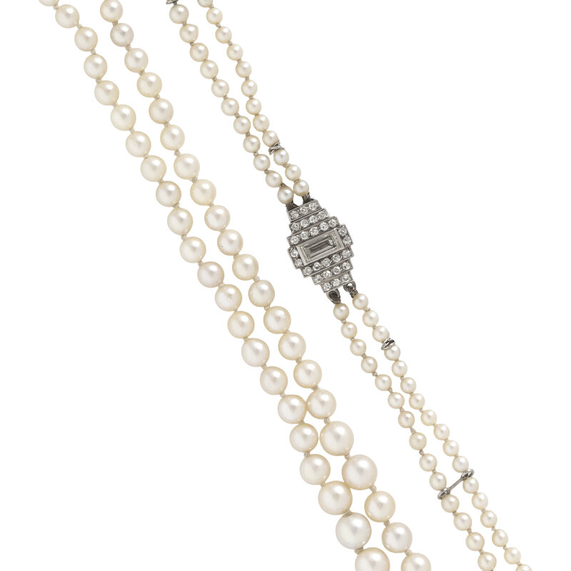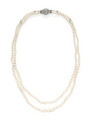 ART DECO, DOUBLE STRAND CULTURED PEARL AND DIAMOND NECKLACE