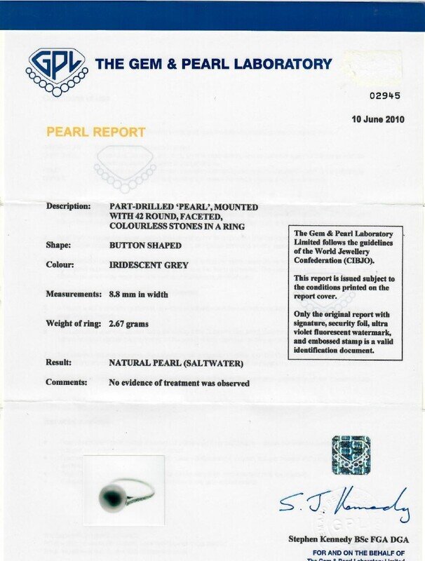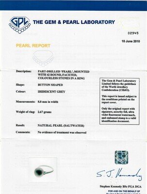 Gem & Pearl Laboratory, 2010, Report No. 02945, Natural Pearl, Saltwater, Button shape, Iridescent Grey color, No indications of treatment
