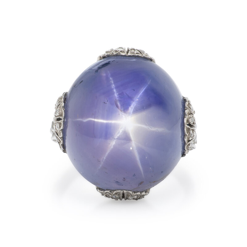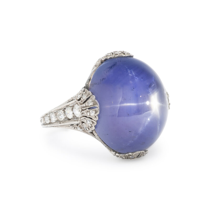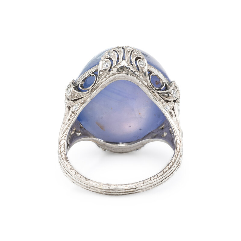 Featuring an oval cabochon star sapphire weighing approximately 34.00 - 36.00 carats by formula, in a hand engraved mounting set with old European and single cut diamonds weighing approximately 0.70 carat total. Mounted in platinum. Ring size 6 1/2.