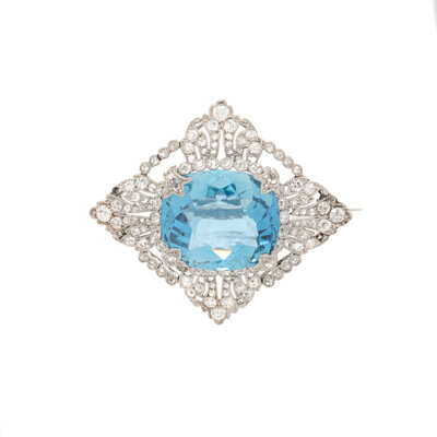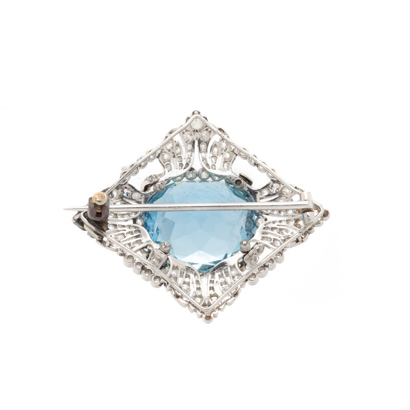 Featuring an oval aquamarine weighing approximately 10.00 - 12.00 carats by formula, set in a milgrain platinum lozenge accented with old European and rose cut diamonds. 1 3/8 x 1 1/4 inches.