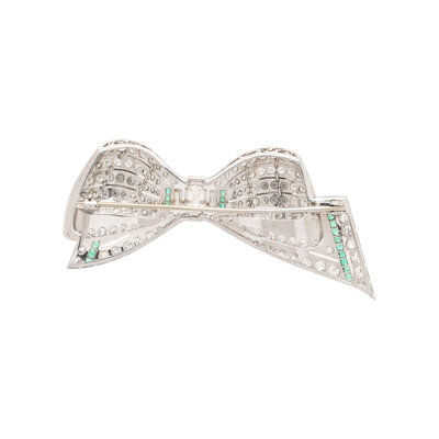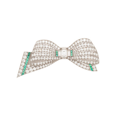 Designed as a bow, with an emerald cut diamond at the center weighing approximately 0.90 carat, and numerous baguette, old European, transitional, and single cut diamonds throughout weighing approximately 5.25 carats total, with square and calibré cut emerald accents. Mounted in platinum. 2 3/4 x 1 1/8 inches.