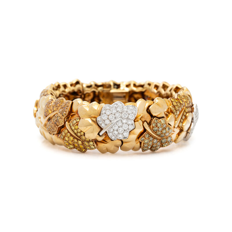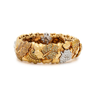 Yellow gold leaf motif links interspersed with yellow, orange, and green diamond-set leaves (origin of color not tested) and surmounted with white gold diamond-set leaf accents, total diamond weight approximately 10.00 - 12.00 carats. Mounted in 18 karat yellow and white gold. 7 inches inner circumference, 7/8 inch wide.