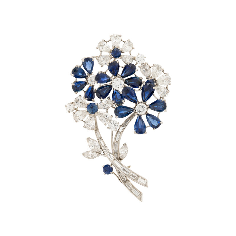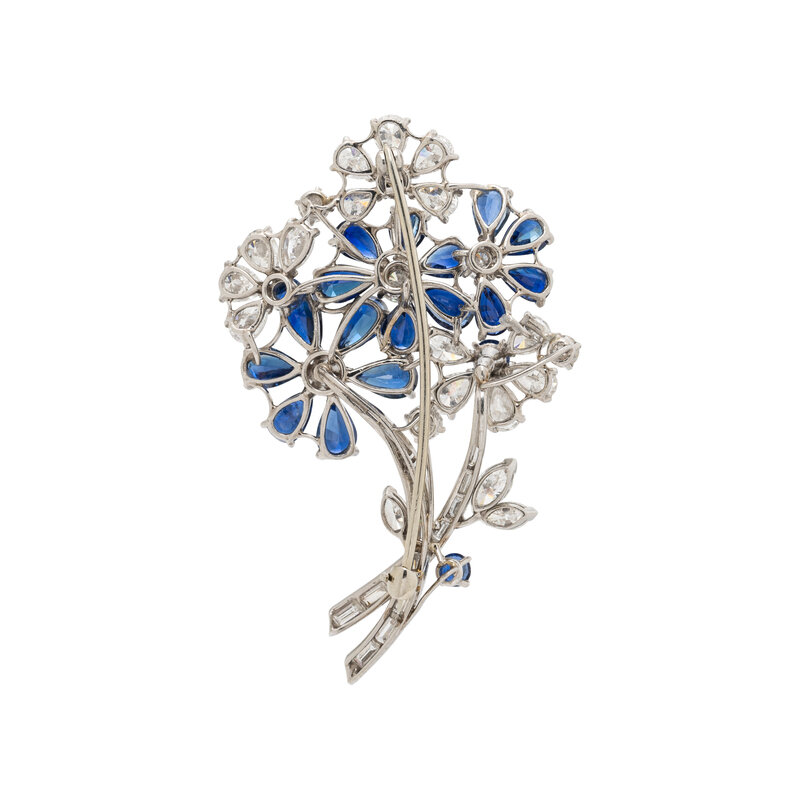 Designed as a spray of flowers, set with round, pear, marquise, and baguette cut diamonds weighing approximately 7.00 carats total, and round and pear shaped sapphires. Mounted in platinum and white gold. 2 1/4 x 1 1/2 inches.