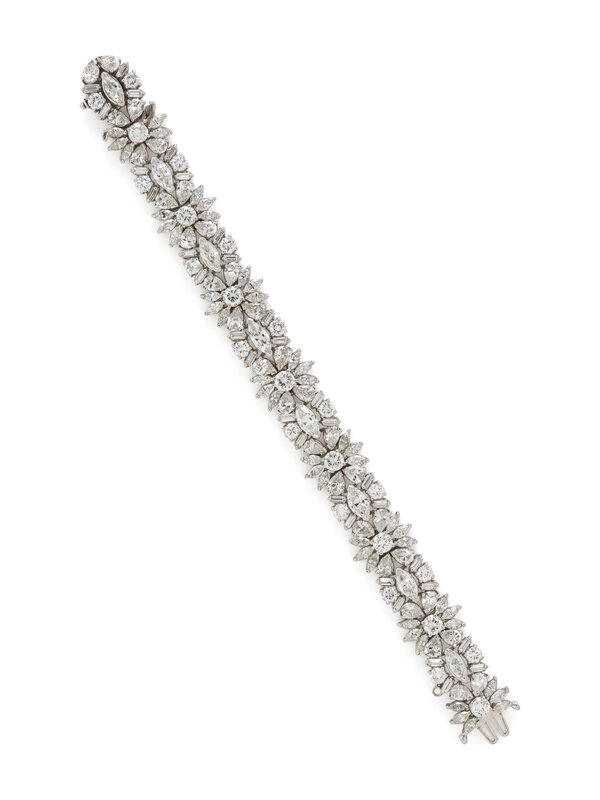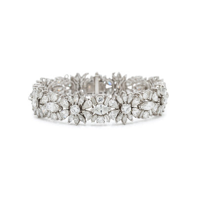 Set with marquise, pear shaped, round, and baguette cut diamonds weighing approximately 23.00 - 25.00 carats total. Mounted in platinum. 7 inches long.