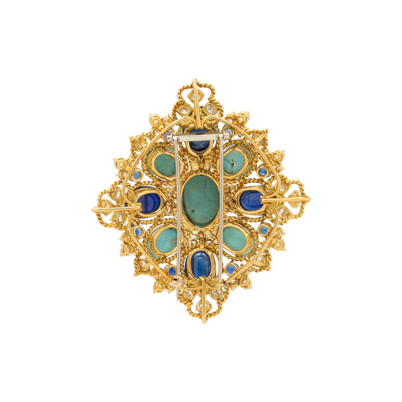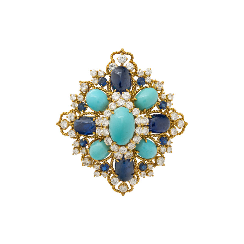 In geometric design of twisted gold wire, set with oval cabochon turquoise, oval cabochon and round sapphires, and round diamonds weighing approximately 8.80 carats total. Mounted in yellow gold. 2 1/2 x 2 1/4 inches.