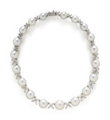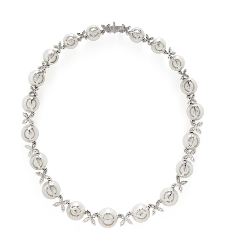 Featuring cultured pearls measuring approximately 11.80 - 15.60 mm, separated by 'X' motif links set with marquise cut and round diamonds weighing approximately 11.17 carats total. Mounted in 18 karat white gold. 16 1/2 inches long.