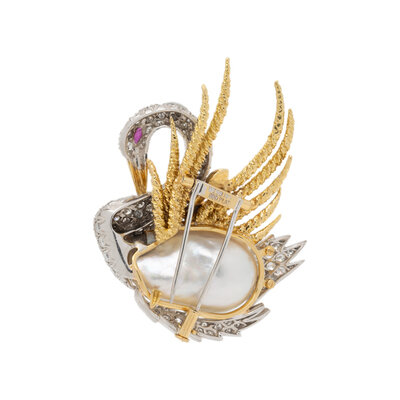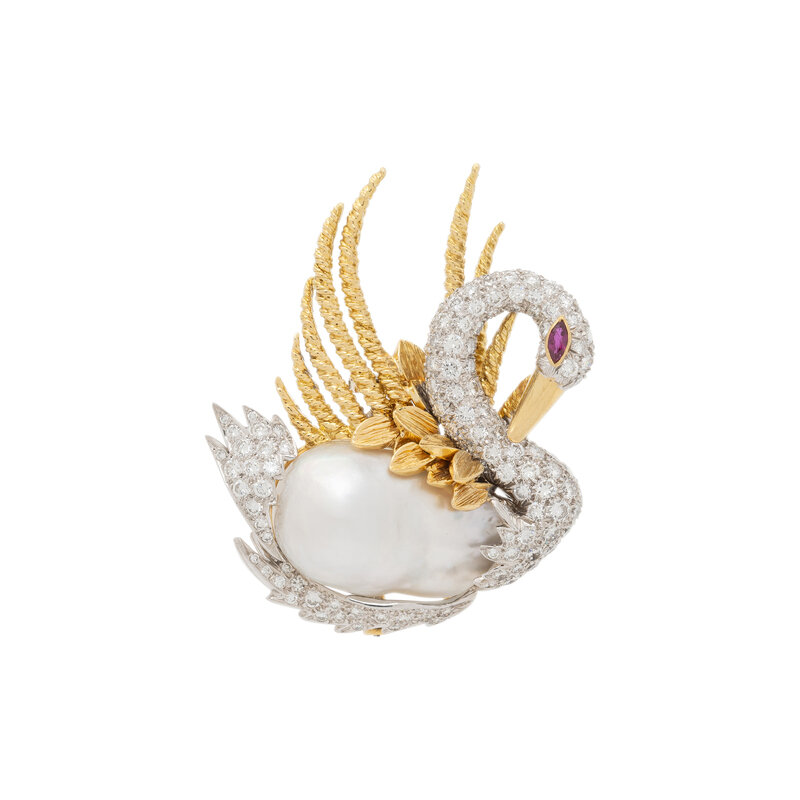 Designed as a swan, the belly formed by a baroque cultured pearl measuring approximately 26.40 x 16.50 mm surrounded by pavé-set round diamonds weighing approximately 3.50 carats total, with textured yellow gold wings and a marquise cut ruby eye. Mounted in platinum and 18 karat yellow gold. 2 1/8 x 1 5/8 inches.