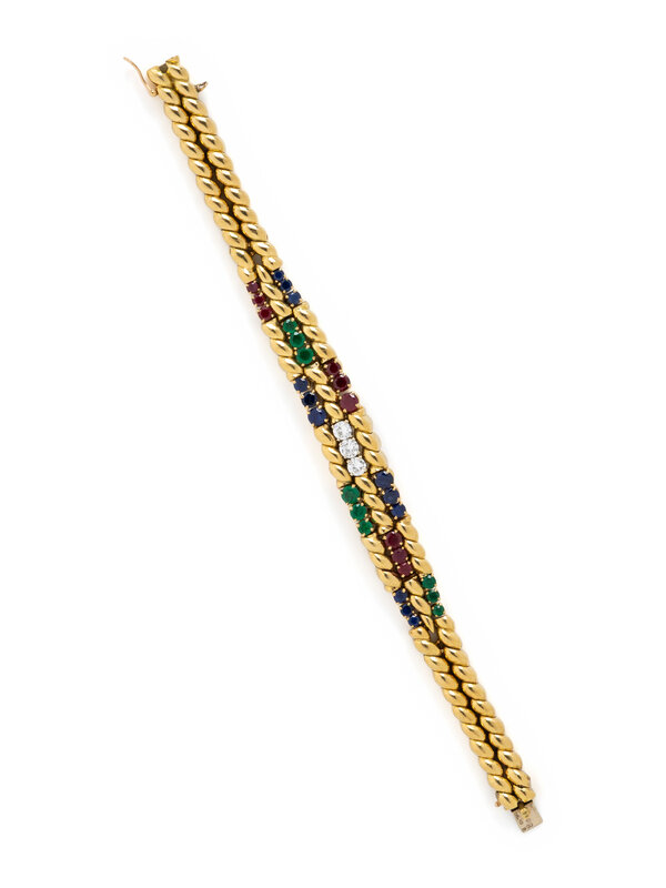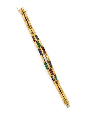 Set with round rubies, emeralds, and sapphires, and round diamonds weighing approximately 0.60 carat total. Mounted in 18 karat yellow gold. 6 3/4 inches long.