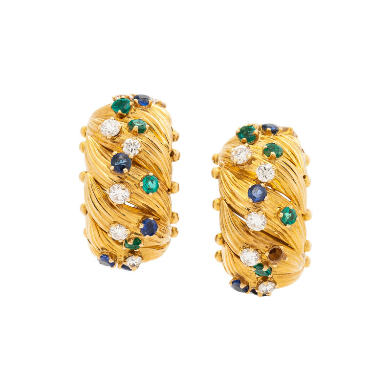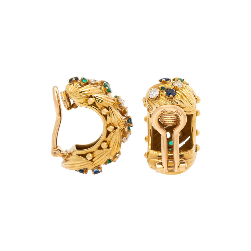 In a twisted gold half-hoop design set with round diamonds, emeralds, and sapphires. Mounted in 18 karat yellow gold. 1 inch long.
