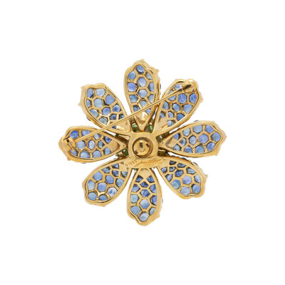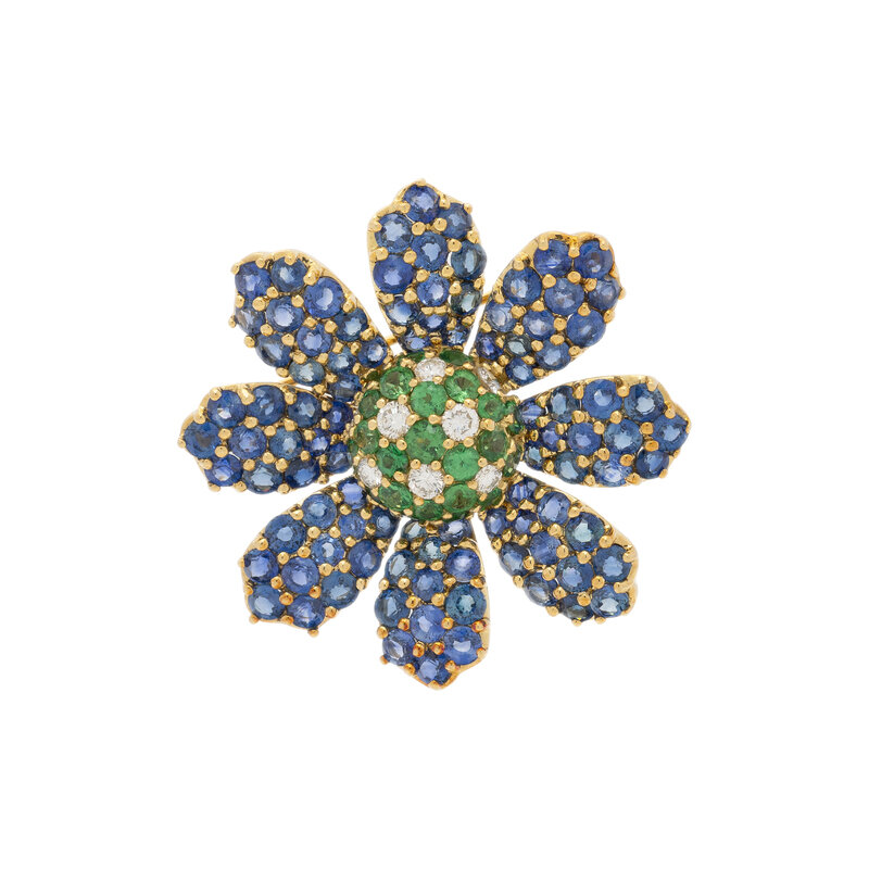 Designed as a flower, the petals pavé-set with round sapphires, and the center with round diamonds and tsavorite garnets. 18 karat yellow gold. 1 1/2 inches wide.