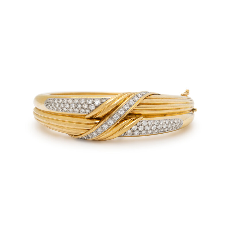 In a tapering, reeded design set with round diamonds weighing approximately 2.75 carats total, hinged with side clasp. Mounted in 18 karat yellow and white gold. 6 1/2 inches inner circumference.