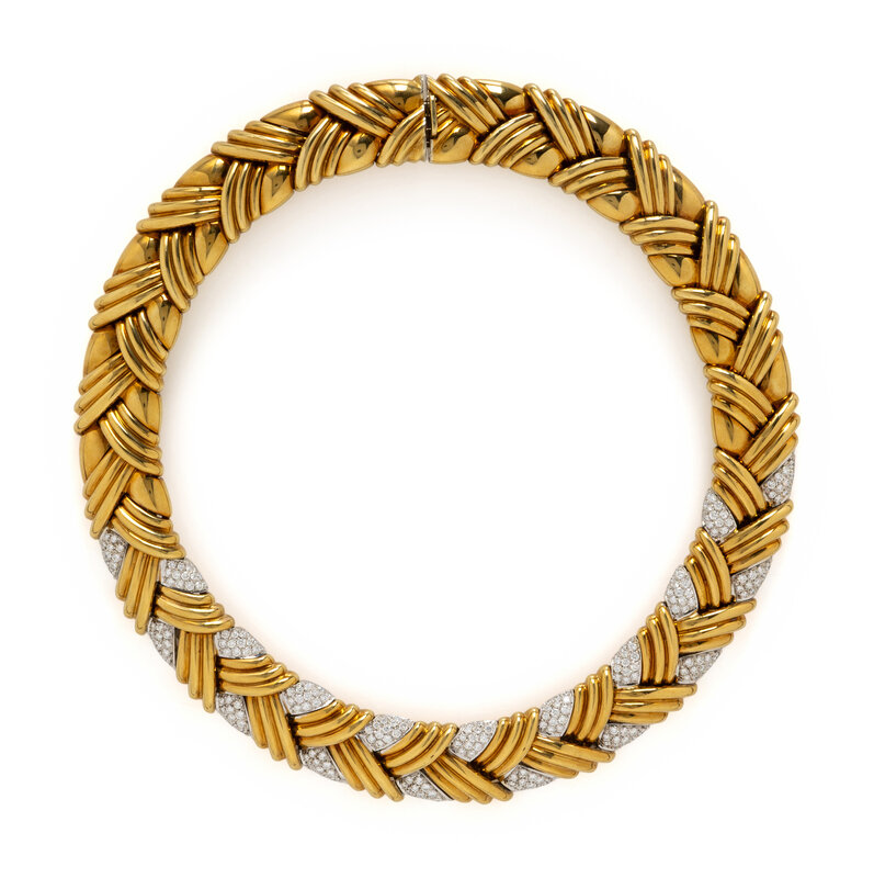 In a braided motif, the front central links pave-set with round diamonds weighing approximately 8.00 carats total. Mounted in 18 karat yellow and white gold. 14 1/4 inches inner circumference, 18.00 mm wide.