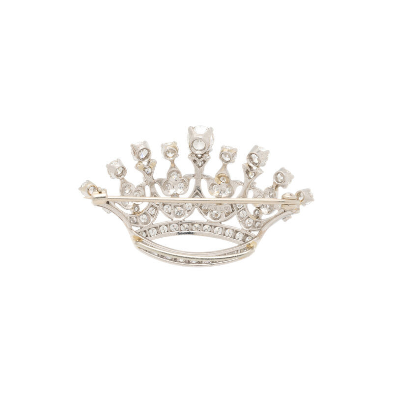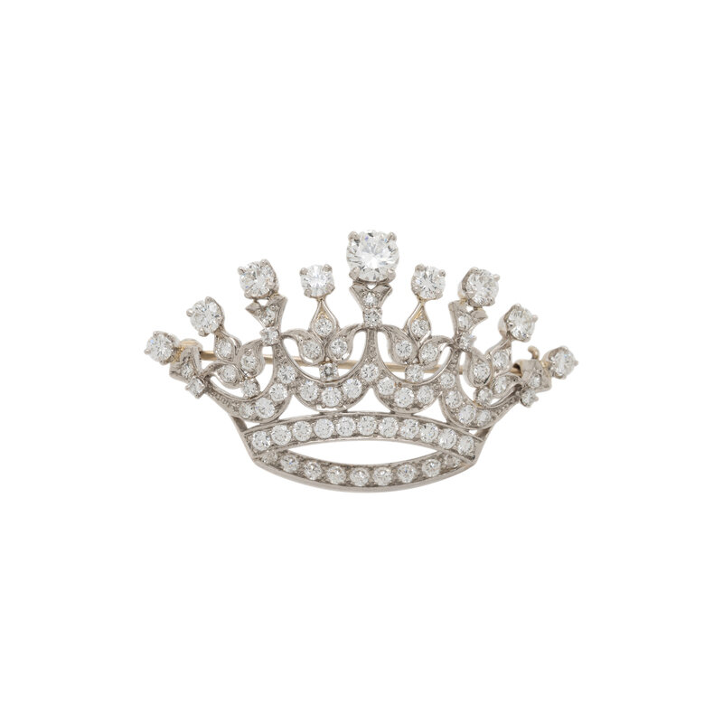 Depicting a crown, set throughout with round diamonds weighing approximately 2.75 carats total. Mounted in platinum. 1 3/4 x 1 1/8 inches.