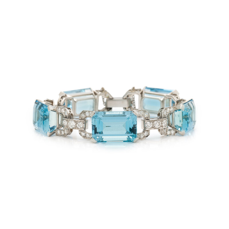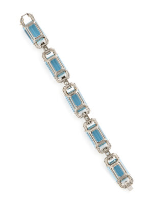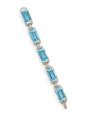 Five emerald cut aquamarines weighing approximately 70.00 - 75.00 carats total by formula, joined by links set with old European and single cut diamonds weighing approximately 3.25 carats total. Mounted in platinum. 6 1/8 inches inner circumference.