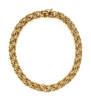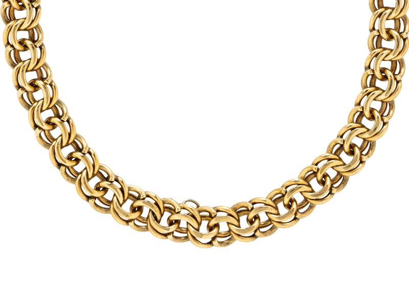 Double links measuring approximately 13.00 mm wide, with a hook at the center where an enhancer could be added. 14 karat yellow gold. 16 inches long.