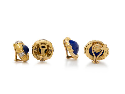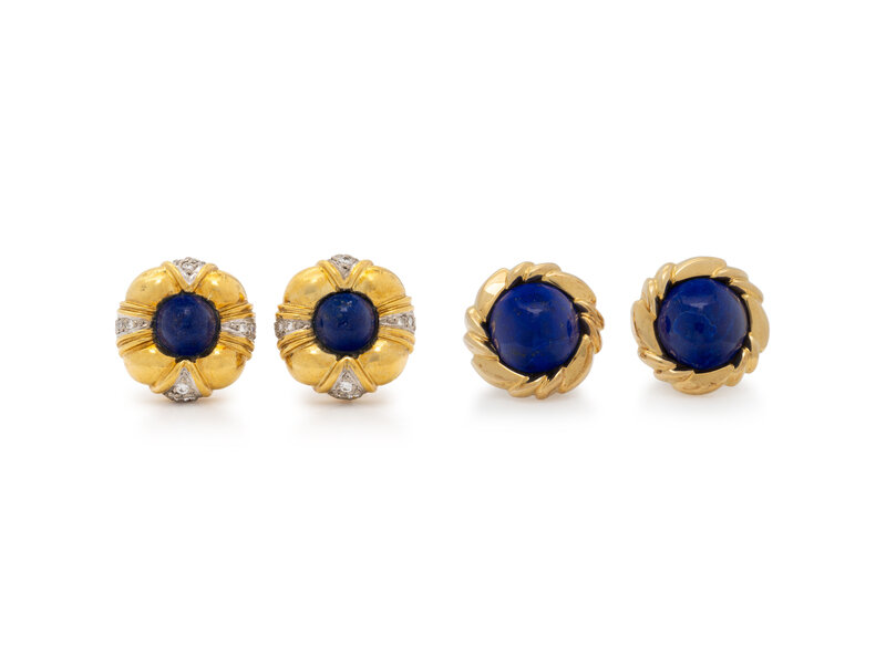 Each designed in a wreath style, one pair set with round cabochon lapis lazuli measuring approximately 13.20 mm wide, the other pair set with round cabochon lapis lazuli measuring approximately 8.90 mm and accented by round diamonds. Mounted in 18 karat yellow and white gold. 7/8 inch and 7/8 inch long.