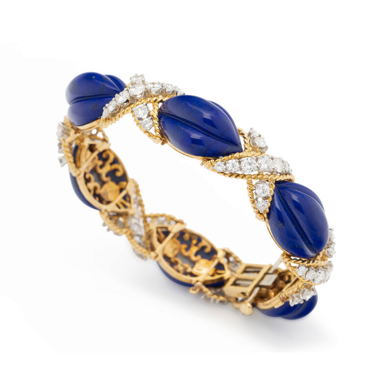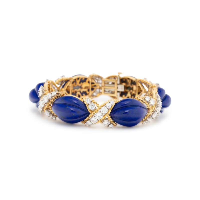 In a flexible design, with fluted lapis lazuli interspersed with 'X' motif links set with round diamonds weighing approximately 6.00 carats total. 18 karat yellow gold. 6 1/2 inches inner circumference.