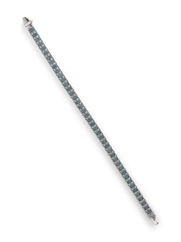 Set with 44 princess cut aquamarines weighing approximately 14.50 carats total by formula. Mounted in 18 karat white gold. 7 1/8 inches long.