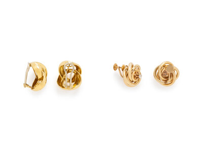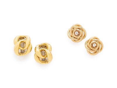 Including a pair of curved curb link motif earrings, and a pair of interlocking ring earrings containing two old mine cut diamonds with screw backs. Yellow gold. 7/8 inch long and 3/4 inch long.