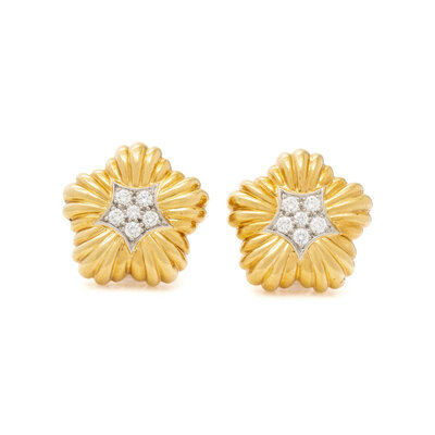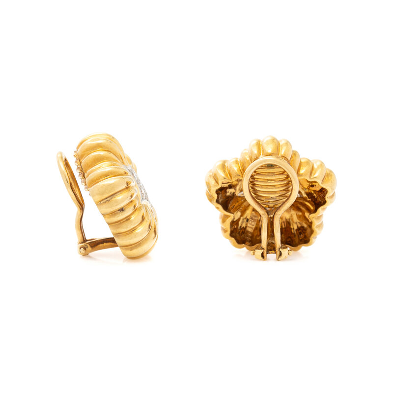 In a stylized flower motif with fluted detail, the centers set with round diamonds weighing approximately 0.70 carat total. Mounted in 18 karat yellow and white gold. 7/8 inch wide.