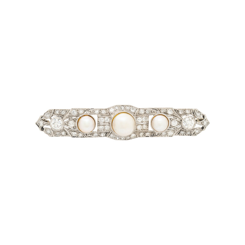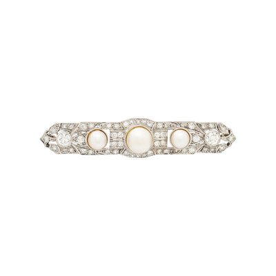 Set with three cultured pearls measuring approximately 6.00 - 8.30 mm, with old European, transitional, and single cut diamonds set throughout weighing approximately 1.40 carats total. Mounted in platinum. 2 1/2 x 1/2 inches.