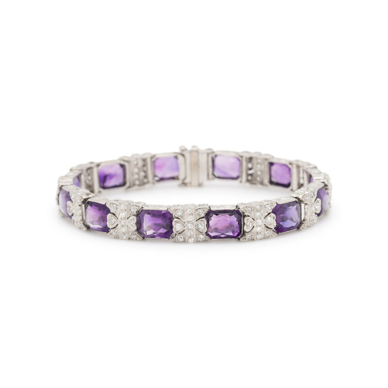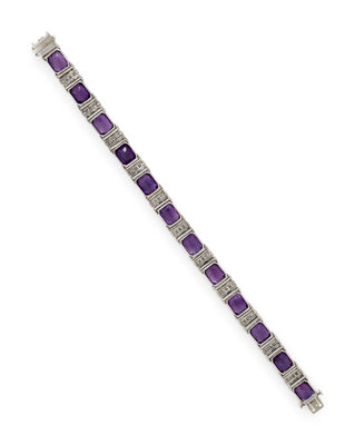 Set with 12 buff-top amethyst measuring approximately 8.00 x 6.45 x 4.75 mm, separated by links set with single cut diamonds weighing approximately 2.05 carats total. Mounted in platinum. 7 inches long.