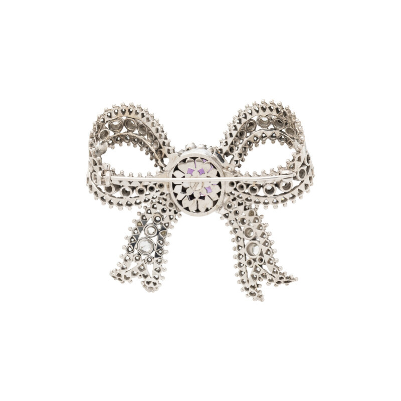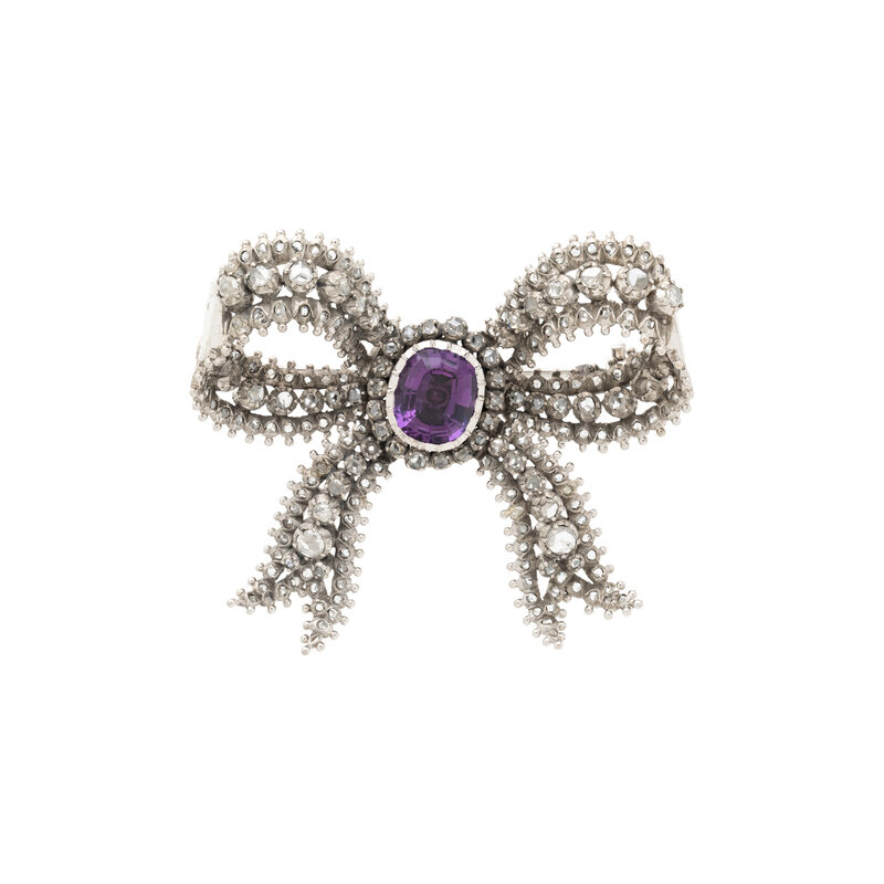 In a bow shape featuring an oval amethyst measuring approximately 12.75 x 11.00 mm, with numerous rose cut diamonds set throughout. Mounted in white gold. 2 5/8 x 2 1/4 inches.