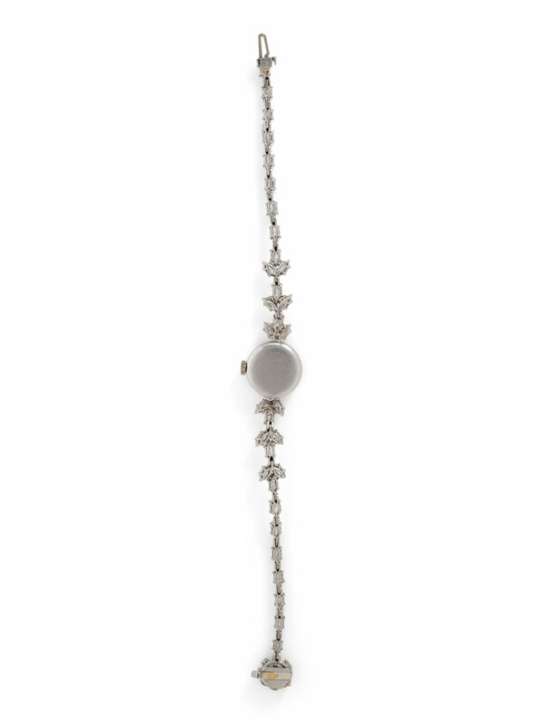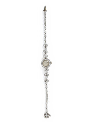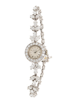 A manual wind watch by Movado, the case measuring approximately 15.00 mm with a silvered dial and round diamond bezel, with additional marquise cut and round diamonds set throughout the integrated bracelet, the diamonds weighing approximately 6.20 carats total. Mounted in platinum. 6 1/2 inches long.