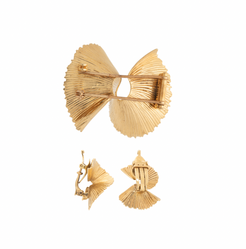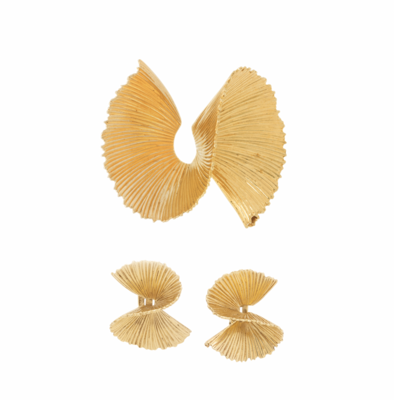 Including a pair of earrings and matching brooch in a ridged undulating design. Mounted in 14 karat yellow gold. Earrings: 7/8 inch long. Brooch: 1 5/8 x 1 3/8 inches.