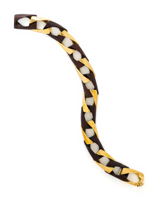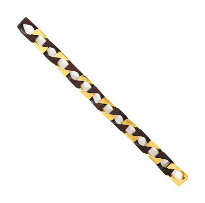With alternating yellow gold and wood curb links measuring approximately 12.90 mm wide. 18 karat yellow gold. 7 1/2 inches long.