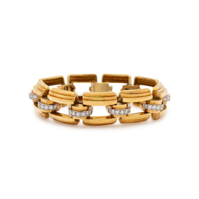 With ridged square links separated by arch links set with round diamonds weighing approximately 2.30 carats total. Mounted in yellow and white gold. 7 inches long.