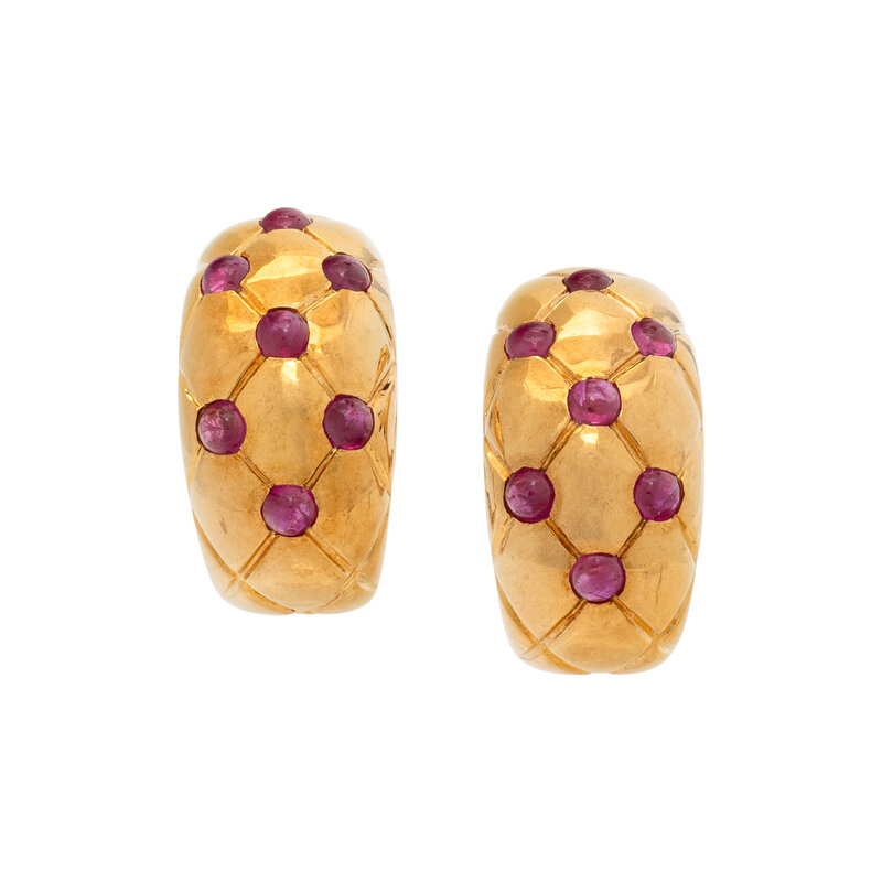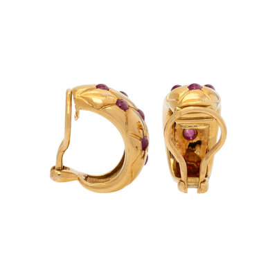 Half-hoop earrings in a quilted pattern set with round cabochon rubies. Mounted in 18 karat yellow gold. 3/4 inch long.