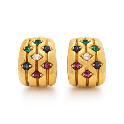 In a ridged design, set with round sapphires, rubies. emeralds, and diamonds. Mounted in 18 karat yellow gold. 7/8 inch long.