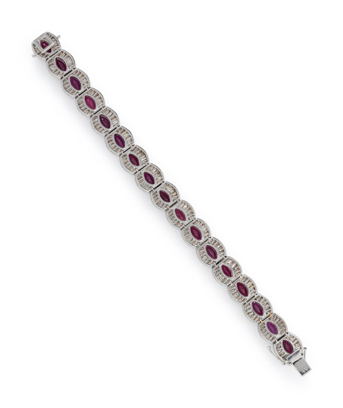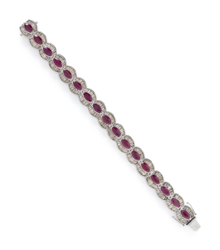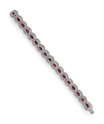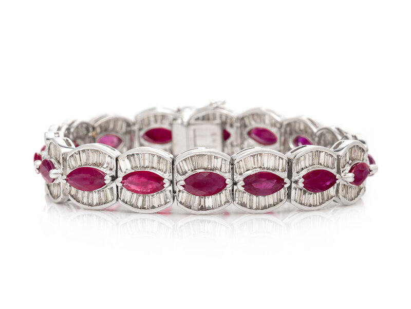 Set with a row of 17 marquise cut rubies weighing approximately 14.00 - 16.00 carats total by formula, and tapered baguette cut diamonds weighing approximately 10.00 - 11.00 carats total. Mounted in 18 karat white gold. 7 inches long.