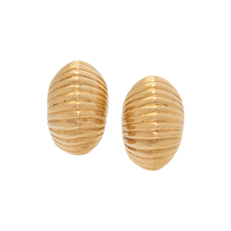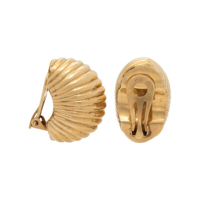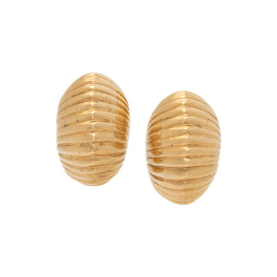 Domed half-hoop earrings with a fluted design. 14 karat yellow gold. 1 inch long.