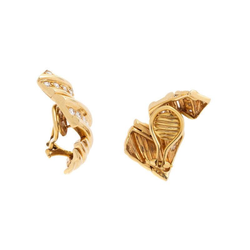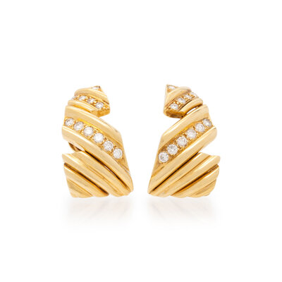 In a ridged zig-zag design set with round diamonds weighing approximately 1.00 carat total. 18 karat yellow gold. 1 1/8 inches long.